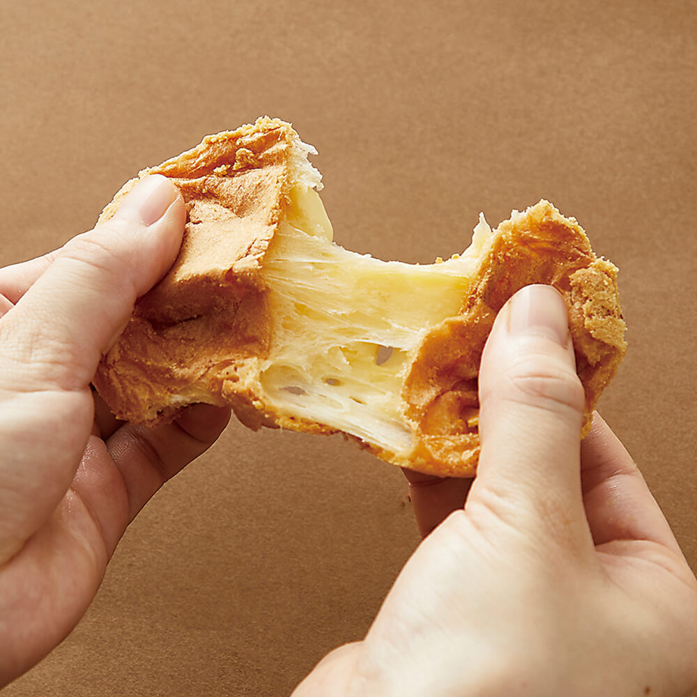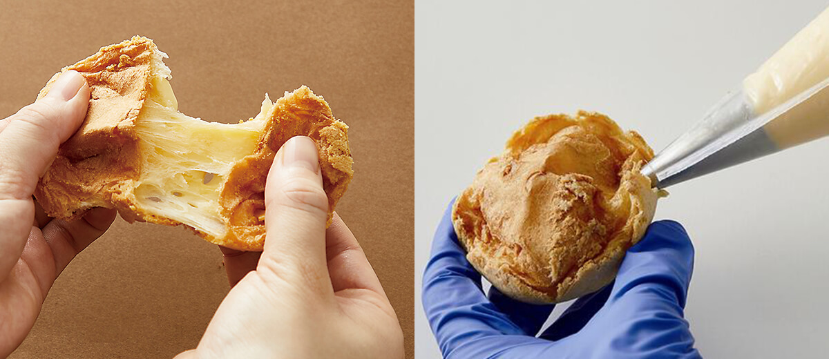 今回の目玉は、外側はサクサク、中身はもちもちの新食感生地にたっぷりのフィリングを絞った「もちっとシュー」。